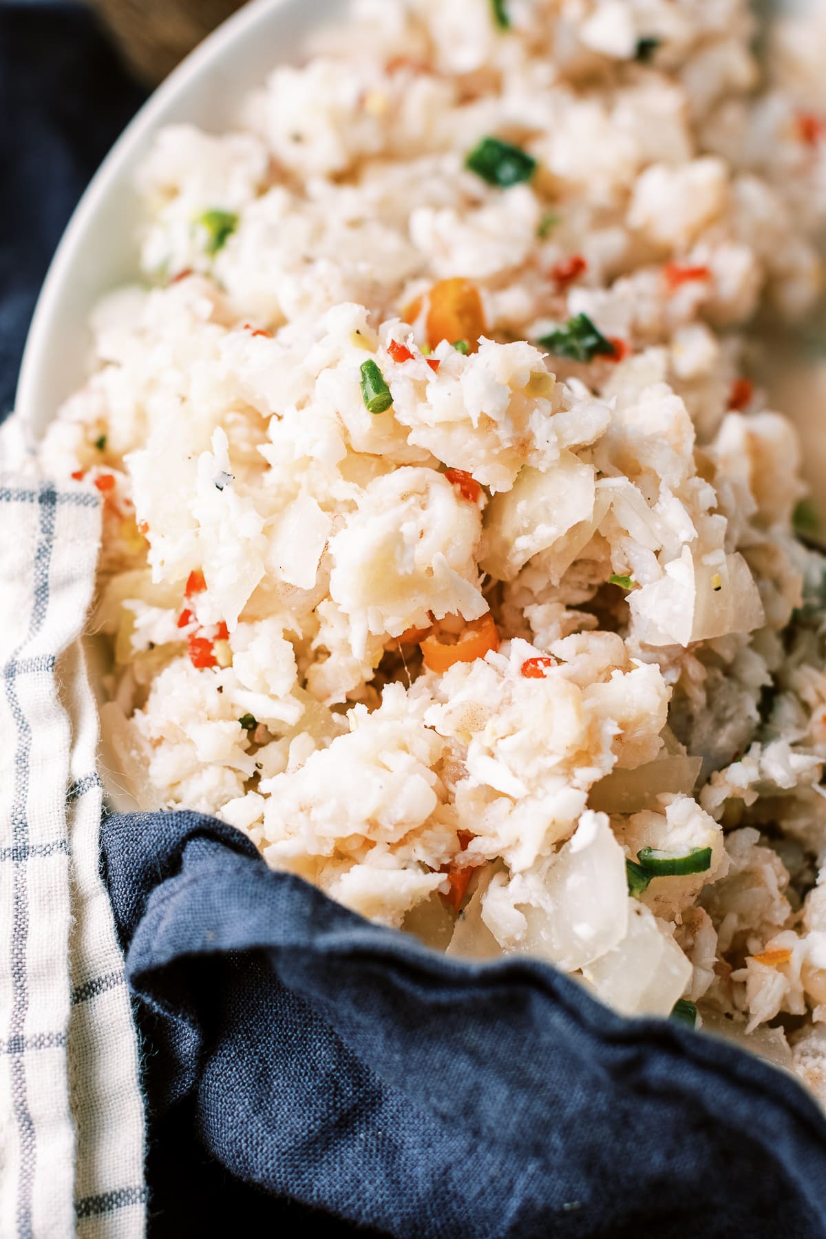 - Stir in grated coconut, lemon juice chopped onion, peppers, and green onion. Place in a shallow baking dish, pat down and cover. let it sit in the fridge 8-12 hours until white and opaque.